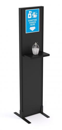Protect your customers and staff from the spread of germs and illness with a free-standing Studio sanitiser station. Based on the Studio screen panel product this stand is a 50mm thick pinnable panel upholstered in Black PU vinyl with a Black aluminium frame to all edges for hygiene and easy cleaning. The stand is supported with two black metal support feet and includes a Black Melteca shelf at 300 mm wide x 180 mm deep..