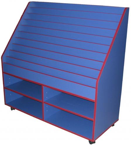 This book display mobile unit has 10 tiers of angled shelving for book display with open shelving under for extra storage space. Manufactured in New Zealand using local materials and labour. Constructed in 18 mm thick Melteca board and fitted with sturdy 50 mm castors